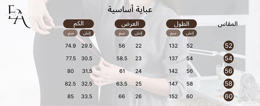 في Edition Abaya نؤمن أن الأناقة الحقيقية تبدأ من طريقة قياس العبايات, فـ اختيار العباية المناسبة لا يكتمل بجمال التصميم وحده، بل يعتمد على الإحساس بالراحة والثقة عند ارتدائها. لذلك نحرص على تقديم نظام مقاسات مدروس يمنحك تجربة شراء سهلة ويضمن لك مظهرًا أنيقًا في كل مرة.